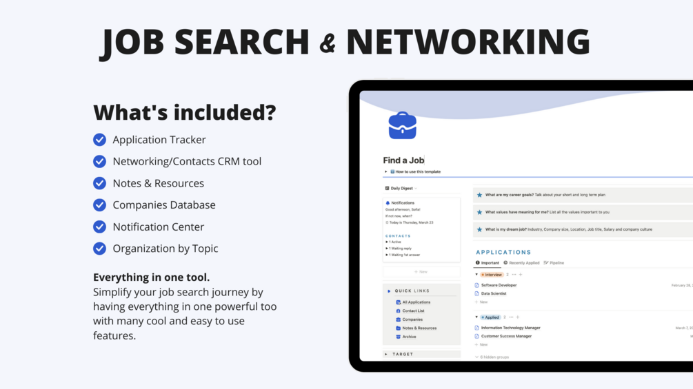 Are you tired of keeping track of your job search and networking efforts on scattered notes and spreadsheets? Look no further than this Job & Networking Tracker template for Notion!